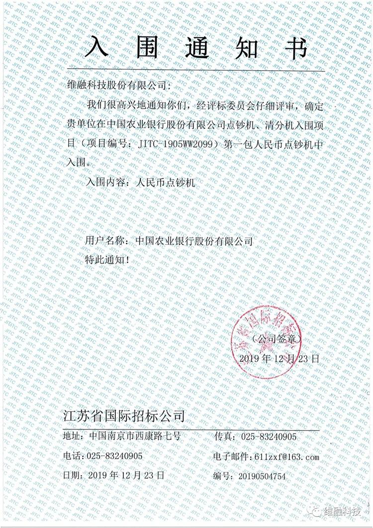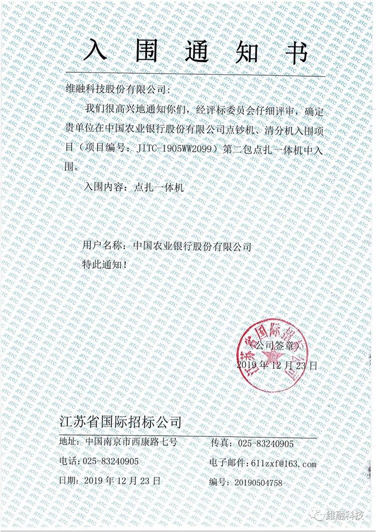 近日,維融科技股份有限公司收到江蘇省國(guó)際招標(biāo)公司發(fā)出的《中國(guó)農(nóng)行股份有限公司點(diǎn)鈔機(jī)、清分機(jī)入圍通知書》(項(xiàng)目編號(hào):JITC-1905WW2099),確定維融科技中標(biāo),中標(biāo)產(chǎn)品包括:人民幣點(diǎn)鈔機(jī)、點(diǎn)扎一體機(jī)。